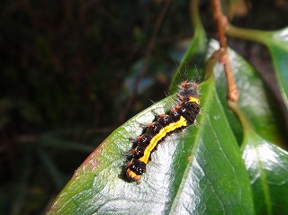 【左】樹上のサトクダマキモドキ 【中】同左 【右】キドクガ 幼虫