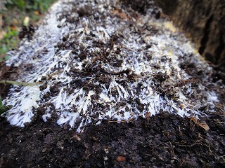 【左】朽ち木の菌糸 【中】コフキサルノコシカケ 【右】会員が持参した植木鉢に生えた「チャダイゴケ」