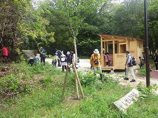新たに整備された宮池エリアの遊歩道で草花遊び(イタドリの葉っぱ鉄砲、ヤエムグラのひっつき虫、シロツメクサの指輪など)をした後、任坊山の森に入ります。