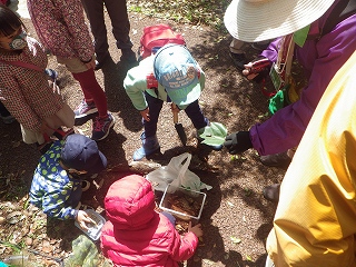 【右】朽ち木内の"虫探しが始まった。本日のテーマではないが、子どもたちは大喜び