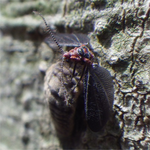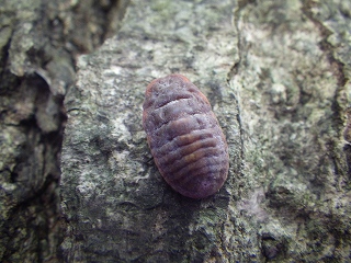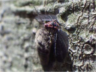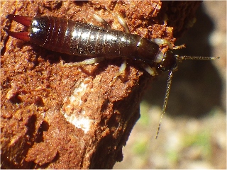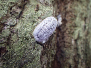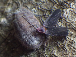 【左】ヒゲジロハサミムシ(朽ち木のなかにいた) 【中・右】オオワラジカイガラムシ(♀:メス)。コナラの木
