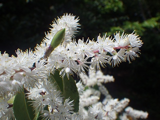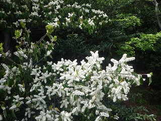 森の中の遊歩道の上にクロバイの白い小さな花が散っていました。クロバイの花は森のてっぺんに咲くのでなかなか間近に見ることができませんが、任坊山では最上部にあるみはらし台の階段脇に背の低いクロバイの木があって、階段を途中まで昇るとすぐ近くで見ることができます。今年もちょうど花盛りで、ほんのり甘い香りがする純白の花を楽しむことができました。