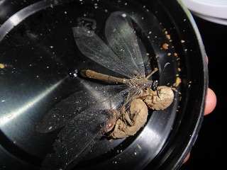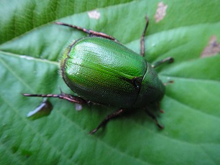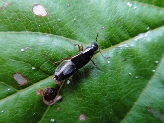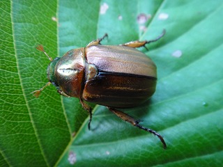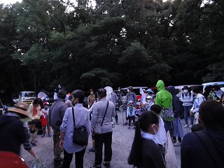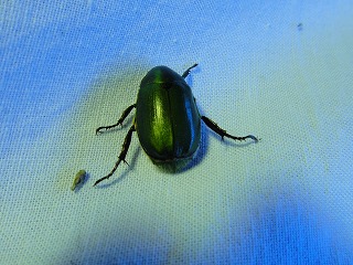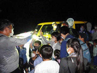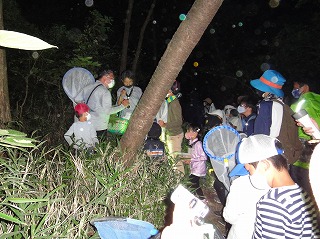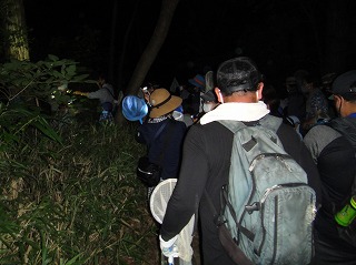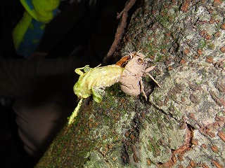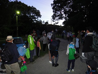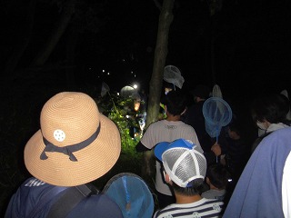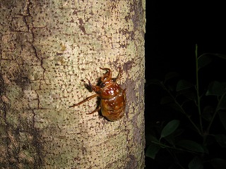 カマドウマ、マカラスヨトウ、コロギス、など毎年見られるものはいなかった。昆虫に詳しい指導員によると、人が多すぎて飛べるものはさっさと逃げてしまうのだとか。ニイニイゼミの羽化が始まっており、誰もがうっとりした。灯火採集の幕に集まる虫たちが案外少なく、アオドウガネやドウガネブイブイのなじみの顔が少し見られた。                    (記・竹内秀)