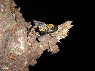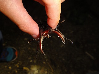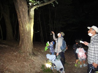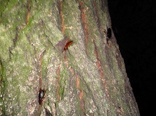 蚊はいつものように人にぶつかるようにして集まってくる。梅雨明けして連日の猛暑なのでキセルガイがさかさまになって木の割れ目に陰を探すようにしてついていた。アリやキマワリ、ヤマトゴキブリ、ムカデは闇夜の中でも普通に生活している。そして、暗闇の中でも虫たちのレストランは大盛況。カナブン、ノコギリクワガタ、コクワガタ、カブトムシ。子供たちばかりでなく、お父さん、お母さんたちも童心に帰って歓声が上がる。スズメバチという招かざる客もいたがタモの威力には勝てず去ると、大きなカブトムシが子供の手に。やったあ!と、いいなあ!と両方の声が聞かれた。