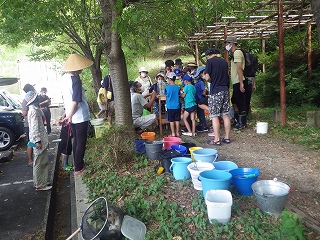 夏の暑さ真っ盛りのとても暑い日でしたが、たくさんの参加者があつまり須賀川で生き物観察会を実施しました。 江コミュニティセンター駐車場に集合し、指導員から川に入る際の服装や履物についての注意及びタモの使い方や生き物の捕まえ方のコツ等の説明を受けました。