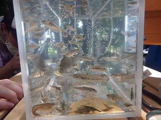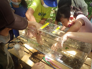 採取した生き物は指導員が用意した水槽に入れ、名前や特徴について、解説をしました。また、アメリカザリガニやカダヤシ、ミシシッピアカミミガメなど、外国の生き物が国内に持ち込まれた経緯についても説明を受けました。