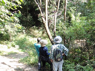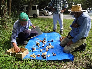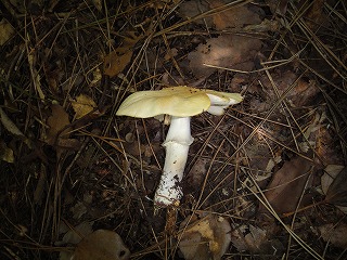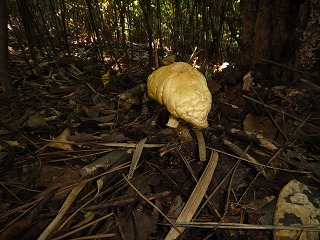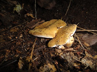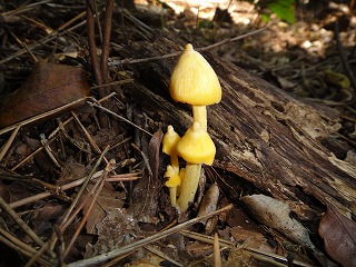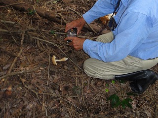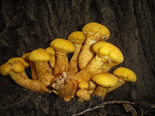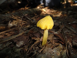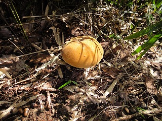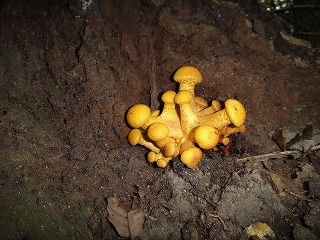 遠くからでも目立つ黄金色のキノコの塊に「たべられるえのきだけか?」と色めき立ったが、オオワライタケで食べられないとわかり、ちょっぴりがっかり。でも、それぞれに手にカメラを持ってやぶ漕ぎする姿は、みんな青年の瞳で(進むスピードはゆっくり)楽しいキノコ観察&研修会となった。        (記・竹内)