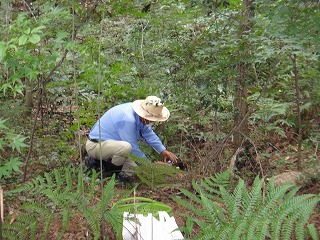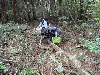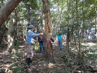 【左】会員のみでキノコ観察   【中】林床にあった指標   【右】雑木林の様相