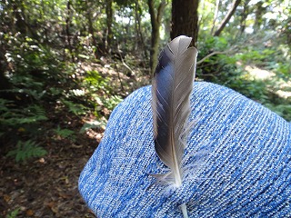 【左】木漏れ日溢れる林床   【中】何鳥の羽? カルガモの次列風切羽  【右】