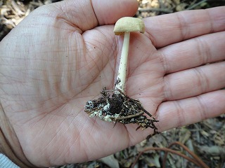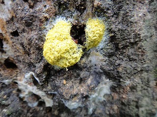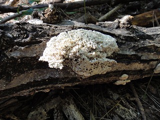 カシノナガキクイムシにより、枯れ木となった直径30センチ位のコナラの木が所々で分解されはじめ、今にも倒れそうになっているもの、アカマツの枝が外れて枝に引っかかって何かの拍子に落ちてきそうなものジョロウグモの巣、の下をかいくぐってキノコを探した。ナラがれしたものに生えると言われるカエンダケは見られなかった。