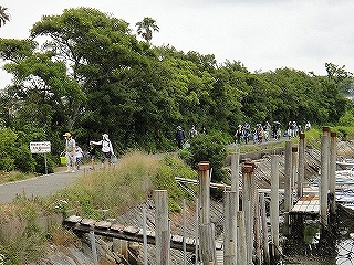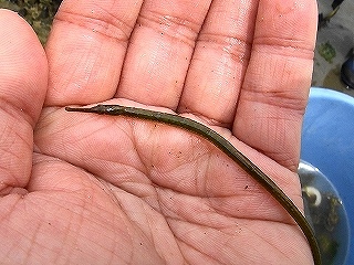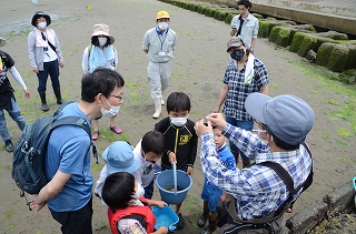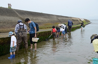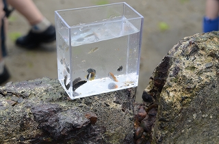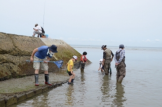 奥田海岸では、午前11時までの約1時間で海岸での生き物の観察、採取等を行いました。参加者はカニやエビ、ハゼ、ヤドカリなどを見つけては楽しそうにしていました。指導員の捕まえた熱帯魚のチョウチョウウオの仲間やヨウジウオなどを見て驚いていました。午前11時には採集を終えて、捕まえた魚やカニ、貝などをみんなで観察しあい、指導員から生き物の説明を聞いて観察会は終了しました。