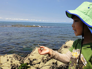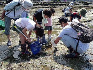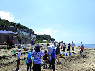 ホテル小野浦側より磯場に移動し、各家族ごとに生き物観察と採集を行う。