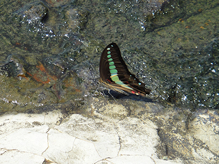 【左】ハサミを掲げて威嚇するイシガニ 【中】ひらひら泳ぐヒラムシのなかま(プラナリアの親戚) 【右】アオスジアゲハが吸水に来ていました