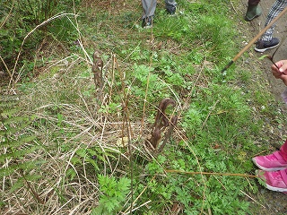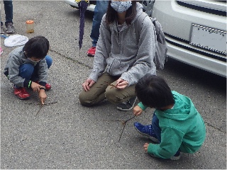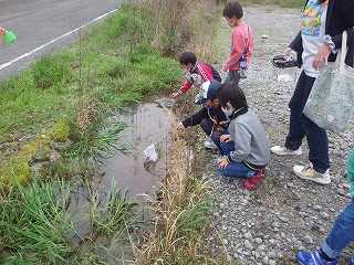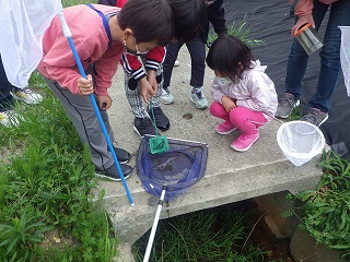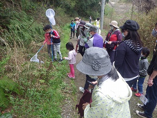 子供たちはタモや虫かご持参で参加してくれましたが、あいにくの曇り空で、虫があまり見つからず、植物についての話や、カエルとオタマジャクシのことなどを学びました。
