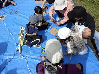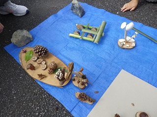 駐車場に戻ってからは、それぞれ工作を楽しみ、最後は作品の展覧会をしました。