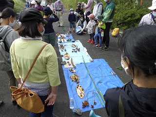 途中、クルミやツバキの実、コナラの実など工作材料を拾い、途中アオダイショウの子どもまで見つけることができました。スズメバチの巣もありました。