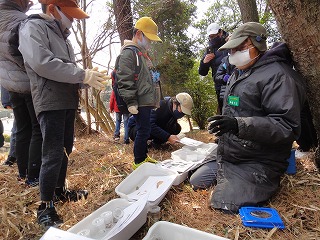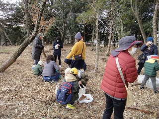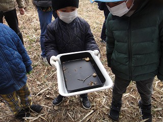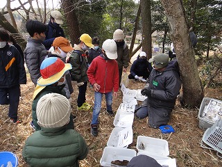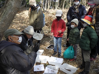 昨日までの暖かさを残しつつも冷たい風が雑木林を吹き抜けていました。2月開催予定の自然観察会8ヶ所の内6ヶ所は主催者によるコロナ感染自粛要請で中止されました。そんな中でしたが当主催者のご協力もあって何とか開催することが出来ました。応募者は予想を超えて9家族15名(人数制限20名)の一般参加を頂きました。観察会をWonderなものにすべく、数日前の下見で蟲トラップを6ヶ所仕掛けておきました。また、過去の観察記録から「落ち葉や朽ち木の下の生きもの」写真図鑑(ラミネート加工)にまとめ当日参加した家族(6家族分)に配布しました。9:30定時開催し担当から「危険な生きもの」「コロナ感染対策」について諸注意をした後、自由に蟲探しを始めました。多数の指導員にも個々の家族に連れ添ってガイドして頂きました。蟲トラップでは期待した種数は採取出来ませんでした。雑木林の林床が乾燥し、朽ち木や落ち葉もブナ科が少ない環境でしたので止む無しでした。それでも伐採木の下や朽ち木の中では20種を超える生きものを見つける事ができました。中でも10匹を超えて採取された生きものはハサミムシ、ムカデ、ダンゴムシの仲間たちでした。約1時間程の採集時間でしたが、あちこちで初めて触る虫たちに驚き、感動の声をあげていました。担当者もそんな声を聞くことをうれしく思います。30分間程の分かち合いの後、数種類の幼虫は好きな子どもに持ち帰ってもらい、残りは撮影後雑木林に戻してやりました。