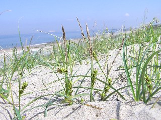 【左】地元の人たちが風砂防止用に育成しているトベラ、シャリンバイ、ハマヒサカキ、アオキです。