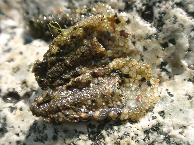 【左】2,3びき捕まえて、池の縁の花崗岩の上にのせたところです。