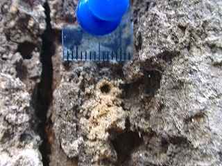 ・入り口付近の樹皮表面のクモの糸にひかかった成虫……2