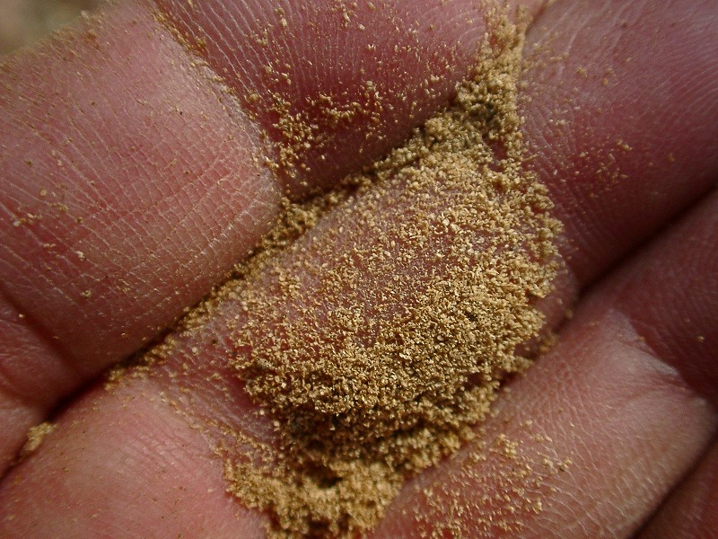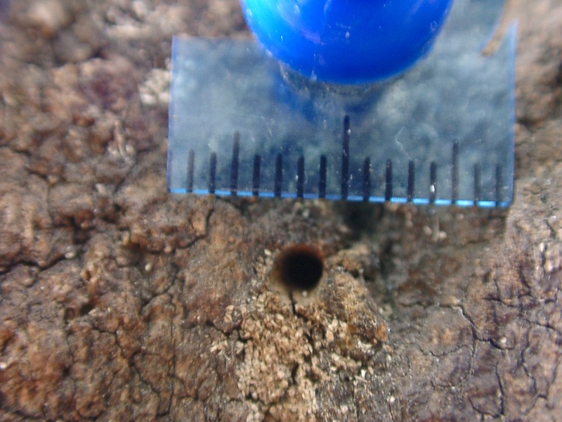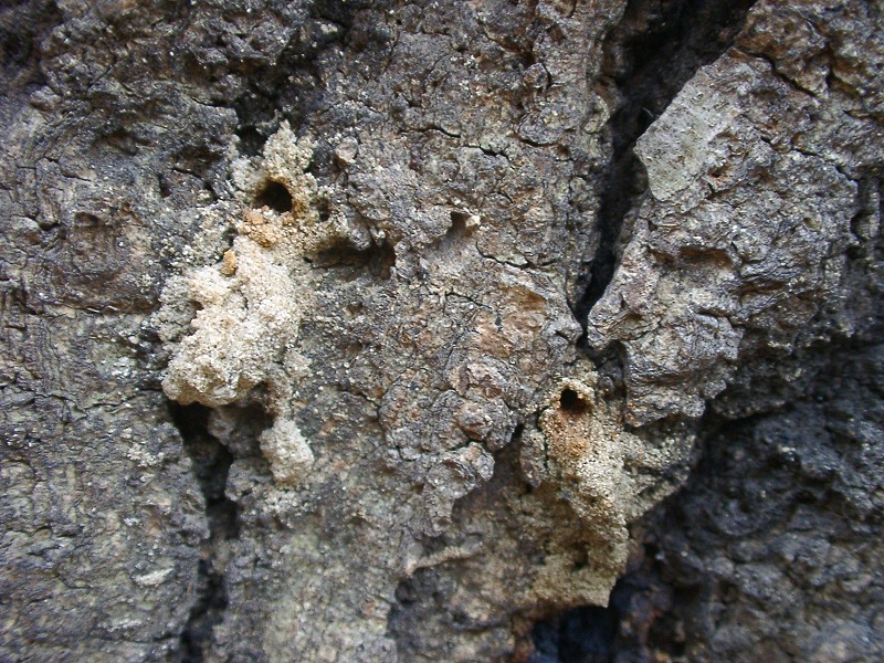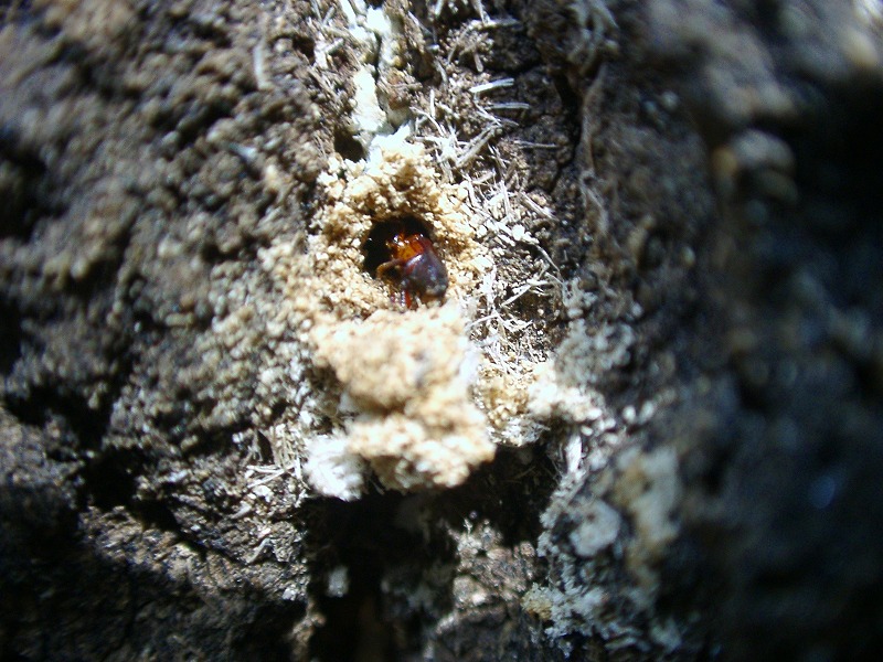 【左】カシナガによる穴(穿孔)の下にはフラス(木屑と昆虫の糞の混合物)が付いている