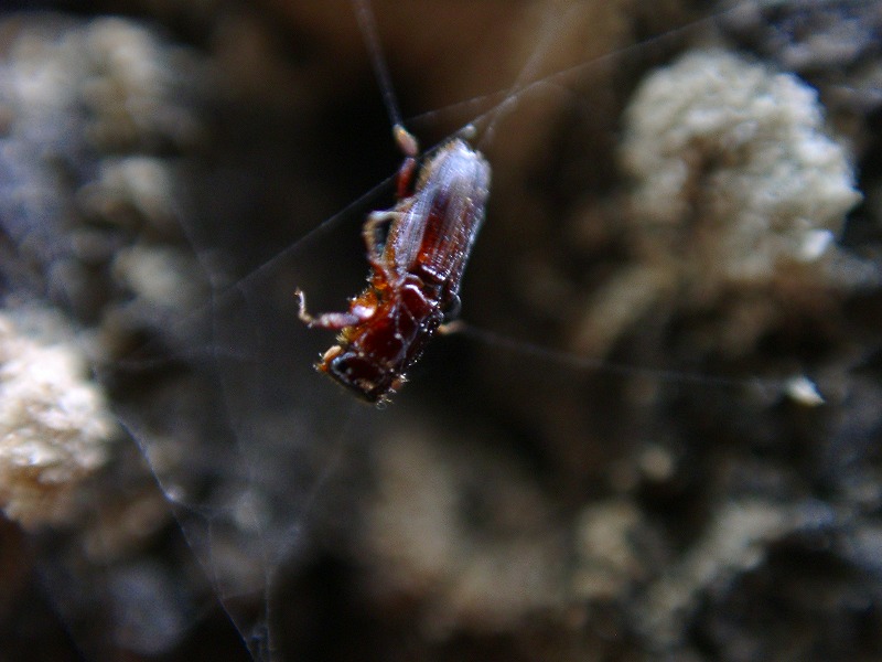 【左】クモの糸に引っかかっている-いつから???  【右】手前が尻でした(取り出して確認)