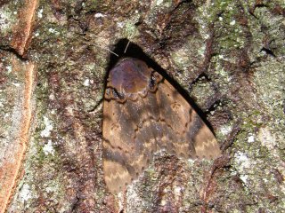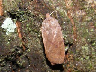 【右】フユシャクの羽化したての♀。樹皮の色に似ていて判別が難しい。