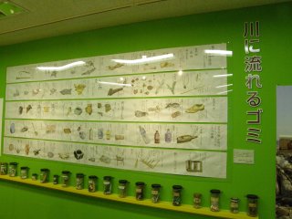 【左】漂着物を利用した作品 【右】川に流れるゴミの展示