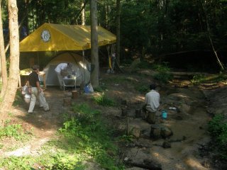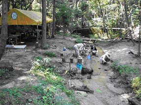 ・9日 14:30〜15:15 活動基地(三叉作業所)前の上山路川の観察と幕営宿泊準備