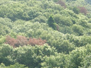 【左】県有林の夜明け 【右】猿投山山麓のカシノナガキクイムシ被害の様子