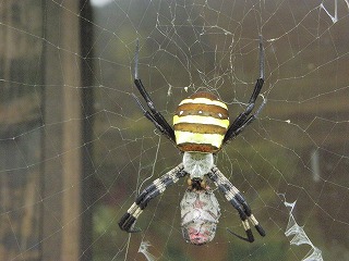 【左】LLC 森のなりわい研究所 【右】なりわい研究所を守っているコガネグモ