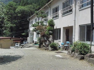 【左】位山演習林事務所 【右】玄関灯の下に置いたペッタンコにかかった虫など