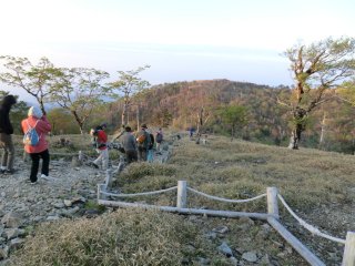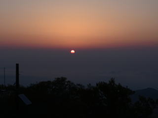 【左】日出ケ岳の御来光 【中】日出ケ岳、頂上展望台 【右】日出ケ岳、下山道