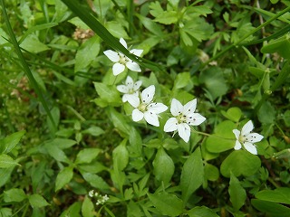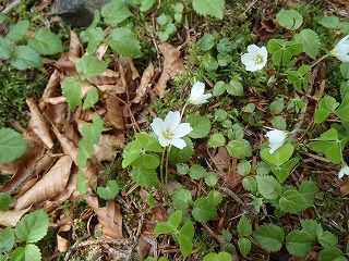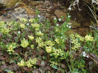 散策をはじめてまず目についたのがミヤマカタバミやワチガイソウ、スミレ類などの小さな花々、ミヤマシキミの花と実。そして倒木や地面を覆うスギゴケ類をはじめとする様々なコケたち。川岸に群生するバイケイソウも小ぶりながら見ごたえがある。様々な小鳥の声が聞こえる。特に美しいのはミソサザイやウグイスのさえずり。