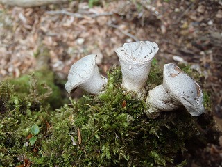 さらに進むとミズナラやブナ、トウヒ、ウラジロモミ、カエデ類の巨木が目につく。そして立ち枯れの木や倒木にはサルノコシカケ科の大きなキノコが生えていた。不思議な植物、ギンリョウソウも至る所に生えていた。エゾハルゼミの抜け殻と思われる透明感のあるセミの抜け殻もたくさん付いていた。ニホンジカとナガレタゴガエルの鳴き声を確認する。散策を終え、駐車場で一部の方がかわいいネズミを観察できたようだ。
