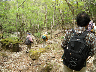 西大台は、日本初、唯一の「利用調整地区」である。「利用調整地区」とは、将来にわたり良好な自然環境を保持するために、立ち入り人数などを調整する地域のこと。私たちはまず、大台ケ原ビジターセンターで事前レクチャーを受講する。そして立ち入り認定証を首から下げ、2グループに分かれて(10人を超える団体での利用は禁止)西大台散策スタート。