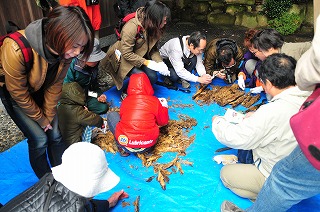 予報は雨、しかし8:30頃雨は上がりました。8:40受付を済ませてから浅井さんと朽ち木観察の準備のため稲荷神社へ行きました。しばらくしてやってきた水野さんと3人で神社境内にブルーシートを敷いてドライバー、軍手、観察カップを並べ降幡さんが持ち込んだ使用済みのホダ木をシートの隅に置いて準備完了です。大野さん、田中さんらが率いる先発グループがやってきました。すぐ朽ち木の分解に取り掛かりました。コクワガタの成虫、幼虫が次々に見つかり、子供たちは大喜びです。キマワリ幼虫、ムカデ、カタツムリなど他にもいろいろな生き物がみつかりました。先発隊が去った後小島さん、榊原靖さんらが後続隊を連れて現れました。朽ち木の分解ではコクワガタだけでなく大きなカミキリムシの幼虫が何匹も出てきて盛り上がりました。分解した朽ち木の後片付けをして11:00過ぎに朽ち木観察を終了しました。(朽ち木は阿久比町板山で会員の関さんがシイタケ栽培をした物をいただきました)(記・平松俊)