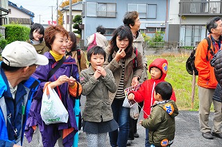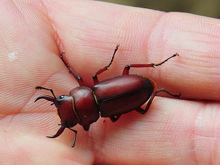 朝からの雨も観察会開始の頃には幸運にも止んでいました。当方は期待を大きく持ちましたが、雨のせいか参加者は少なめでした。地域文化センターの広場に集合し、他支部の観察会員も手すきの当会会員も含めて2班に分かれて観察を始めました。2班は馬池の野鳥観察に向かい、1班は逆コースを選択して稲荷神社の朽木の虫観察に向かいました。1班は民家の生け垣の朱に色づいたカラスウリの実を観察し、神社では3人の会員の指導のもとで、ドライバーで朽木の中の虫を探しました。朽木はシイタケ栽培の廃材で、他から持ち込みました。子供でも簡単にわれた上にコクワガタの成虫が続続現れ子供達を夢中にさせました。異論はあると思いますがイベントとしては成功でした。境内の朽木も観察しましたが成果はよくなかったそうです。観察予定時間の半分になったところで、朽木の虫観察を終了して背戸ノ池に向かいました。下見の時に家の人に了承を得ていましたので生け垣のイスノキの虫こぶを皆で取って鳴らしてみました。背戸ノ池にはハシビロガモがいました。コガタスズメバチの巣や水路や田んぼを観察しながら帰路の馬池にむかいました。馬池では野鳥担当会員から説明を受けながら望遠鏡や双眼鏡で野鳥を観察しました。ダイサギ、ヒドリガモ、ホシハジロ、カルガモなどが観察できました。11時に現地で解散し、地域文化センターに戻りました。(記・大野)