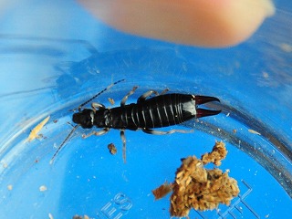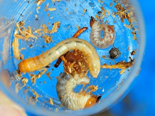 神社の朽ち木:昆虫:コクワガタ幼虫、ヨツコブゴミムシダマシ成虫、キマワリ幼虫、ヒゲジロハサミムシ成虫、幼虫