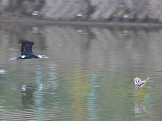 【左】カワウ           【中】カワウとコガモ          【右】ダイサギ