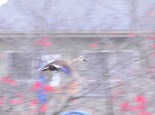 【左】向こう岸に冬鳥がいました          【中】カモのお母さん鳥は地味でした        【右】カモとカワウが飛び立ちました