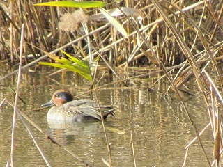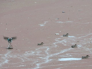 【左】一面、外来のアカウキクサがはびこっている。コガモ?       【中】ヒドリガモ       【右】カルガモ