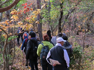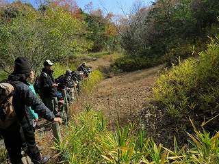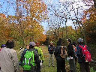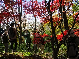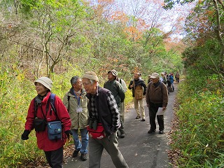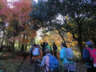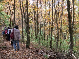 【左】交流観察会は2班に分かれて出発      【右】紅葉の最盛期の中を進む