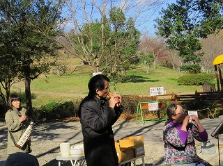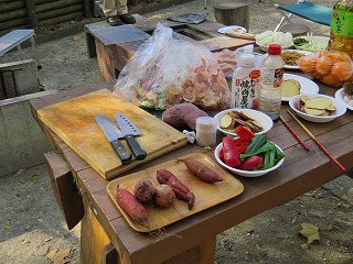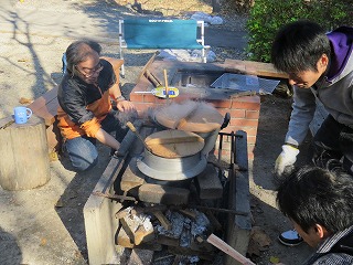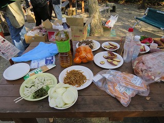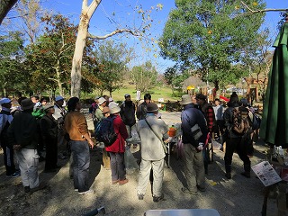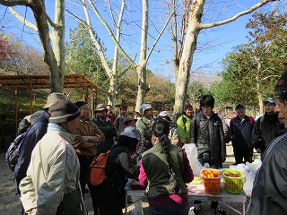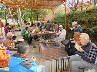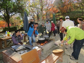 お昼は、バーベキュー場でオカリナの演奏を聴きながら、豚汁、たれにつけた特製の牛肉、むかごごはん、ドングリコーヒー、差し入れのみかん、さといもなど、自分で持参したおにぎりをいただき、満腹になりました。