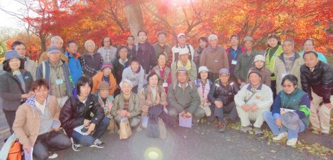 【左】皆さん、ご機嫌に記念撮影                           【右】モミジの下でもう一枚