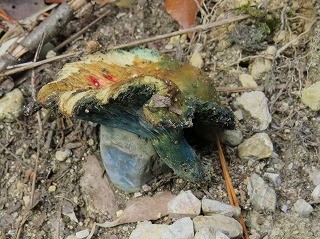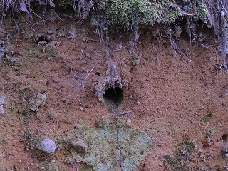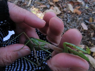 【左】ムネアカハラビロカマキリ(外来)       【中】カワセミの巣穴       【右】ハツタケの老菌