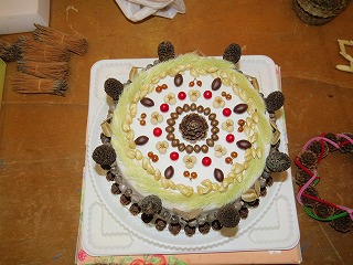 【左】自然物のケーキ。材料、カラマツ・エゴ・ナンキンハゼ・サルトリイバラ・ヘクソカズラ・ハクウンボク・コバンソウ・エノ コログサ ヤシャブシ・ヤマノイモ・ジュズダマ・カボチャ・ヒノキ