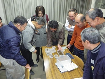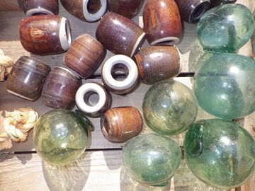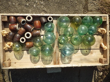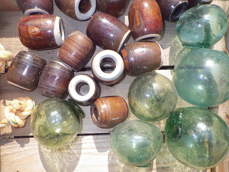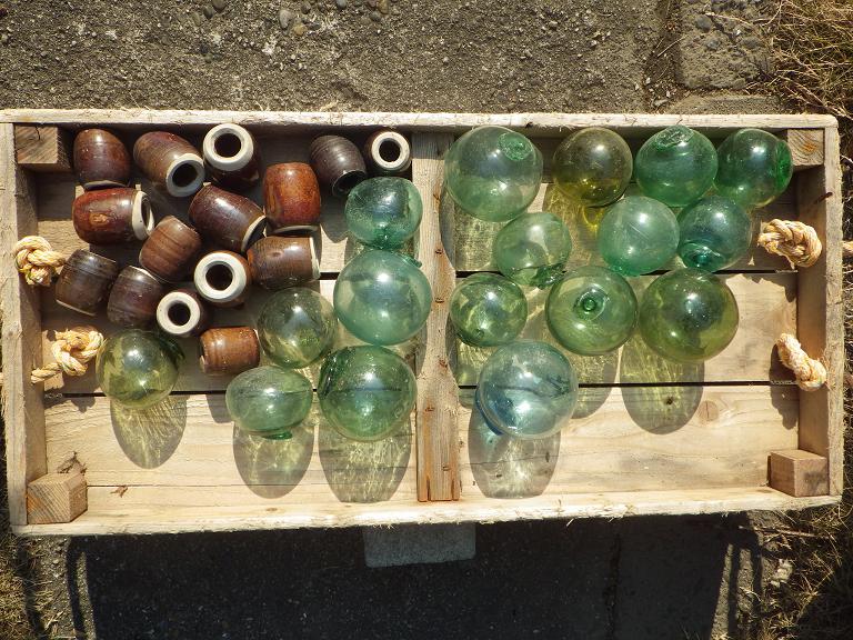 ○榊原正氏が全国の海岸(主に能登半島日本海側)で採集したガラス浮き球と陶製重りを持参