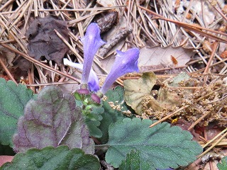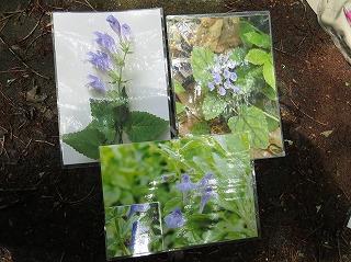 【左】シソバタツナミソウの葉裏を観察 【中】上左ラショウモンカズラ。上右シソバタツナミソウ。下ナミキソウ 【右】シュンラン