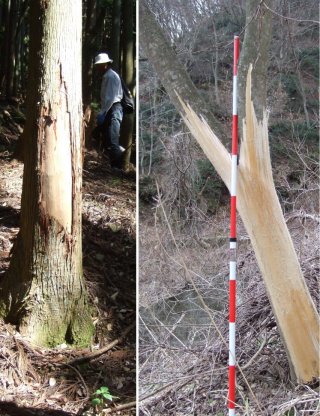 【左】シカ、イノシシ、クマの樹皮の剥ぎ方の違い解説 【中】測量ポールを使い測定 【右】ムササビの食べ痕